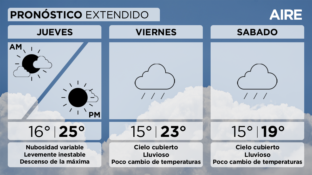 El viernes tendremos condiciones inestables con cielo predominantemente cubierto y probables precipitaciones. Temperatura mínima de 15°, máxima de 23° y viento leve de direcciones variables.