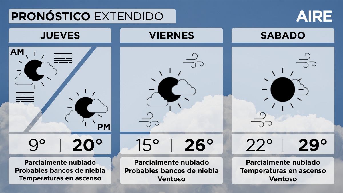 El viernes el cielo continuará parcialmente nublado y las temperaturas irán en ascenso, esperando una mínima de 15°, máxima de 26° y viento leve a moderado del noreste con probables ráfagas fuertes.