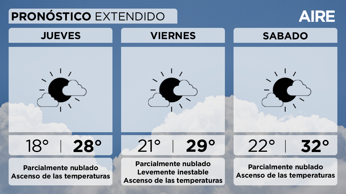 "En Santa Fe, esta situación de cielo parcialmente nublado se extendería hasta el sábado, manteniendo una leve chance de lloviznas aisladas, sobre todo en la noche. Además, se espera que el sábado tenga los mayores valores térmicos, con máximas que rondarían los 32° y sensaciones térmicas que posiblemente busquen acercarse a los 40°. En cuanto al domingo 24, se afirma la inestabilidad en los modelos de pronóstico".