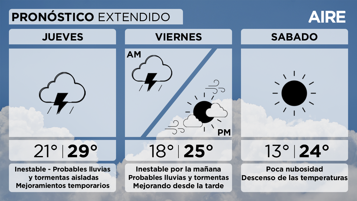 El viernes todavía serán inestables las condiciones, con probables lluvias y algunas tormentas, pero mejorando desde la tarde. Temperaturas en descenso con mínima de 18° hacia final de la jornada, 20° por la mañana, máxima de 25° y viento leve a moderado del sur con posibles ráfagas de mayor intensidad.