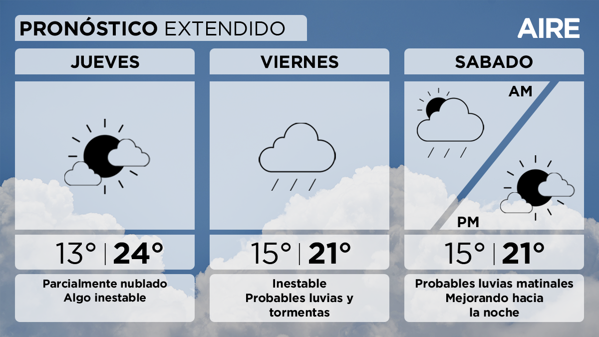 El sábado persistirán las condiciones inestables, con probables precipitaciones. Mejorando hacia la noche. Temperatura mínima de 15°, máxima de 21° y viento leve a moderado del sur.