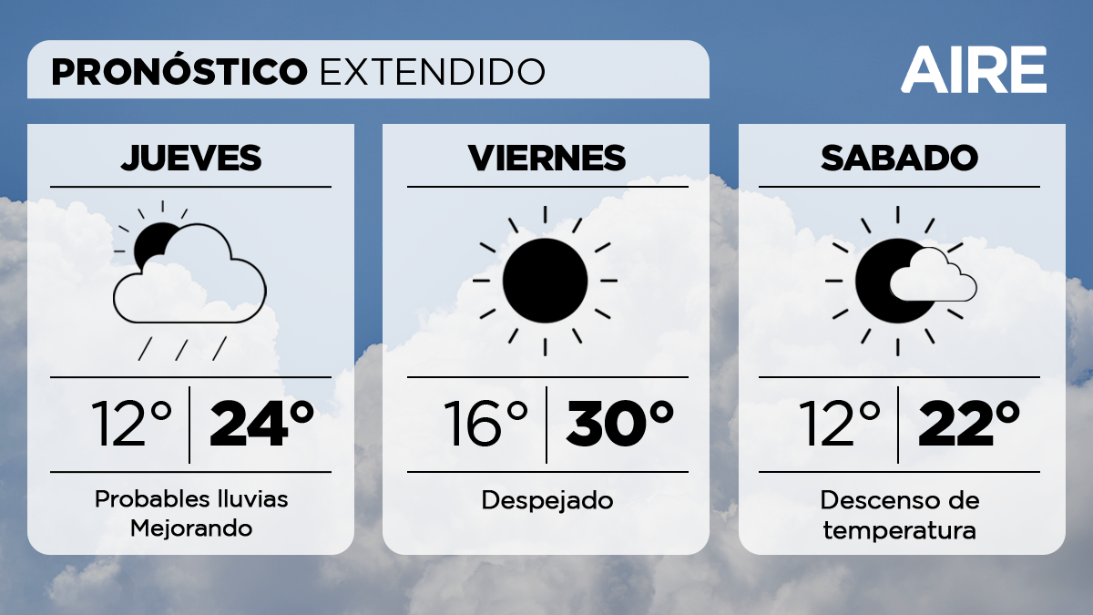La inestabilidad se extenderá a las primeras horas del jueves. Para esa jornada se prevén condiciones inestables en las primeras horas, con probables precipitaciones, pero mejorando desde la tarde. Temperatura mínima de 12°, máxima de 24° y viento leve a moderado del sudoeste con algunas ráfagas de mayor intensidad.