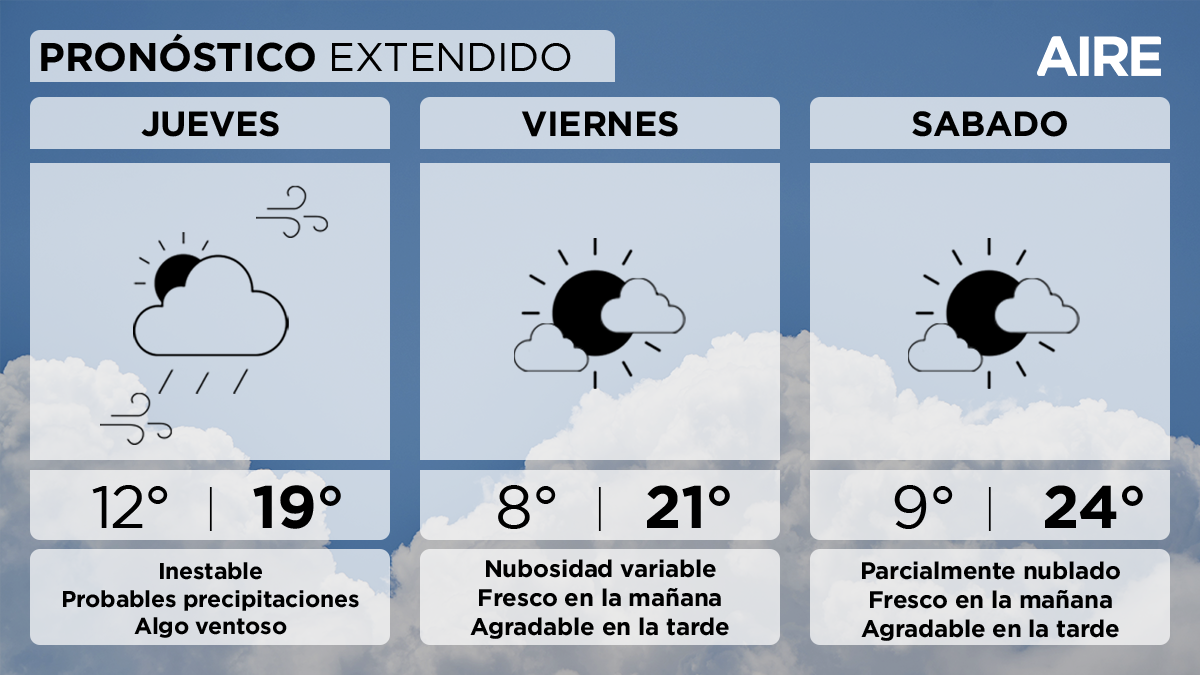 El jueves comenzará con condiciones inestables, con la probabilidad de algunas precipitaciones, aunque se espera que el tiempo mejore hacia la noche. La temperatura mínima será de 12°, máxima de 19 y el viento leve a moderado del sur.