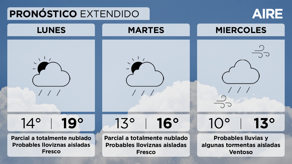 El miércoles las condiciones serán más inestables, esperando lluvias y algunas tormentas. La temperatura mínima será de 10° y la máxima de 13°, con viento leve a moderado del sur con posibles ráfagas de mayor intensidad.