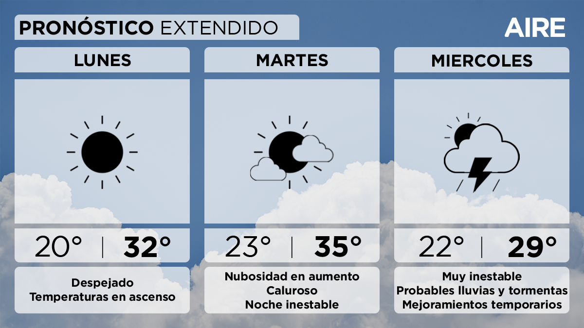 El ingreso de aire cálido y húmedo desde el noreste producirá una elevada sensación térmica en la tarde del martes y hacia la noche ya podrían ocurrir lluvias y tormentas en la región. Esta situación de inestabilidad se prolongará hasta el lunes 18 inclusive, alternando lluvias y tormentas -que podrían ser fuertes en algunos sectores- con mejoramientos temporarios.