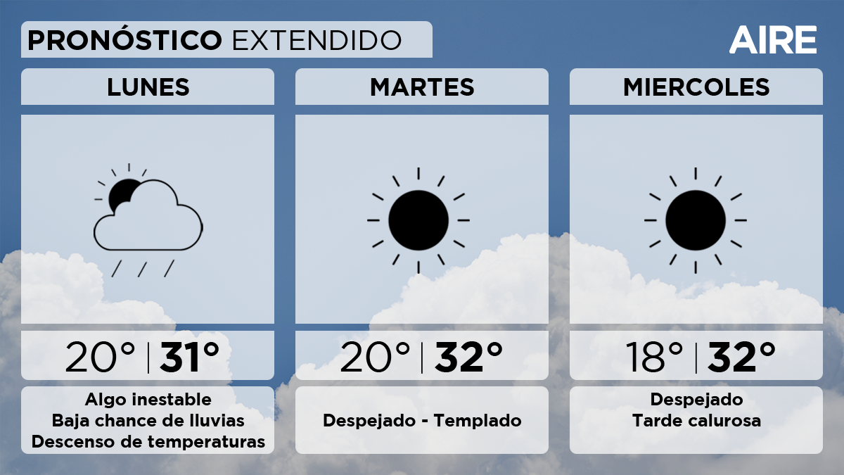 Esto vendrá acompañado de un leve descenso de las temperaturas, aunque lo que más descenderá será la sensación térmica. El pronóstico indica que desde el martes las condiciones serán estables (con una baja chance de inestabilidad el jueves) y los valores térmicos tendrán variaciones a lo largo de la semana.