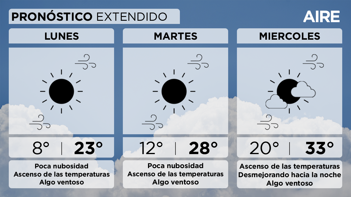 Para el martes 15 de agosto también se espera poca nubosidad. Temperaturas en ascenso con mínima de 12°, máxima de 28° y viento leve a moderado del norte.