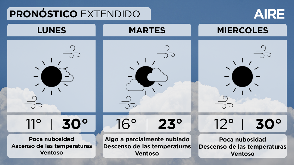 "Sin embargo -adelantó- se espera que las temperaturas asciendan debido a la rotación del viento al norte o noreste que ocurrirá durante este lunes. De esta manera, es posible que las máximas en la zona alcancen los 30°, ya que el viento será intenso y podrá tener ráfagas cercanas a 60km/h".