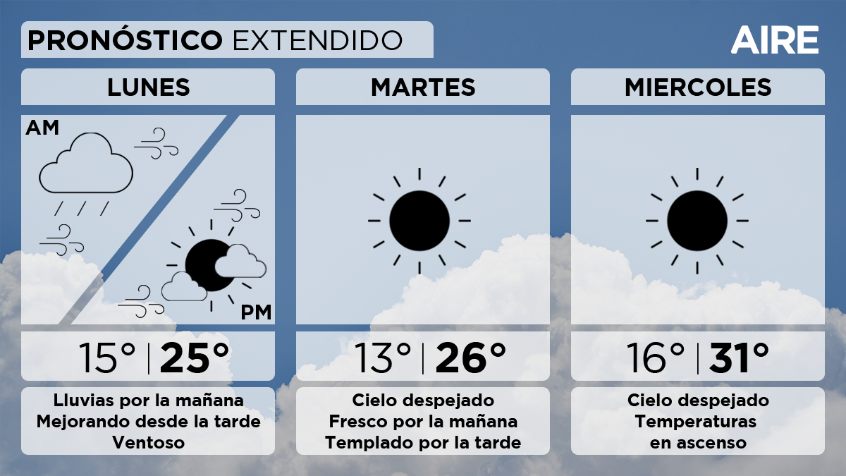 El miércoles continuaremos con cielo despejado o con poca nubosidad. Temperaturas que comenzarán a ascender con mínima de 16°, máxima de 31° y viento leve de direcciones variables, pero predominando del norte.