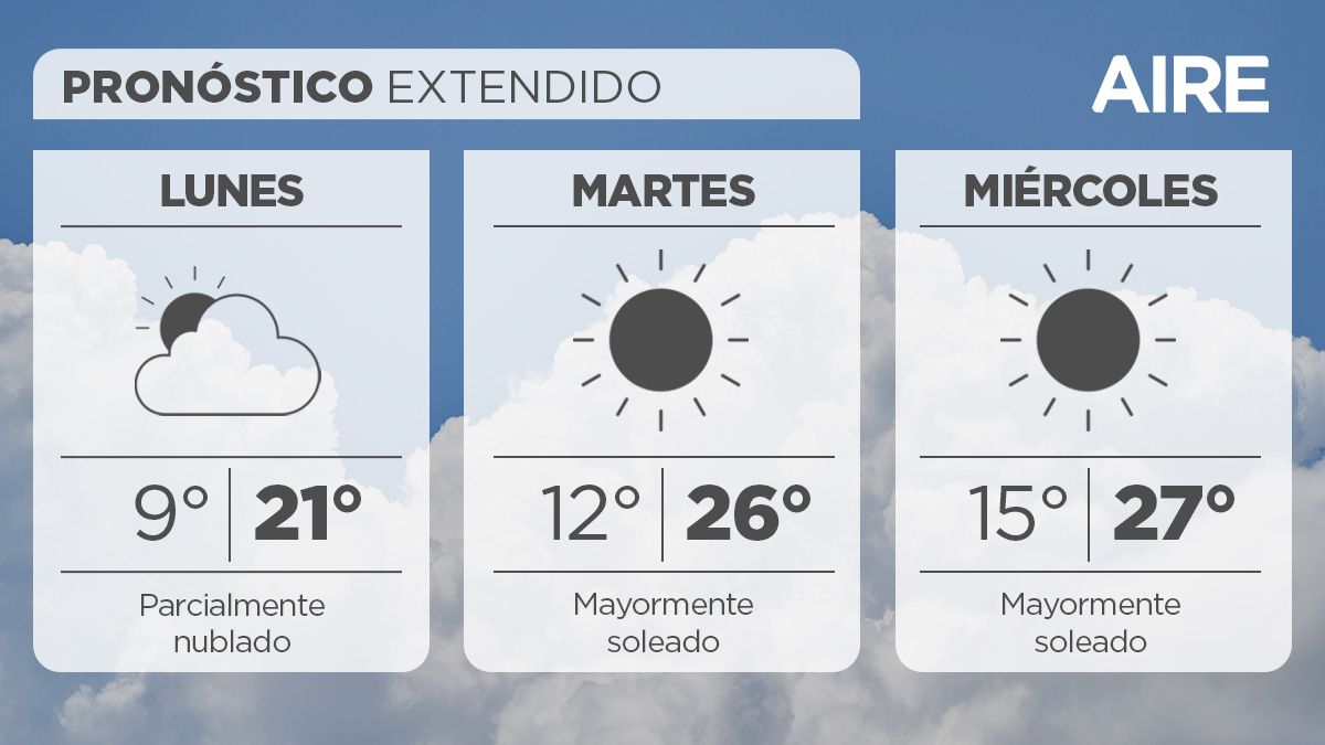 La semana continuará con buen tiempo. El martes se espera un día de sol, con una mínima de 12° y una máxima de 26°. El miércoles el día estará mayormente soleado. La temperatura mínima será de 15° y la máxima de 27°.