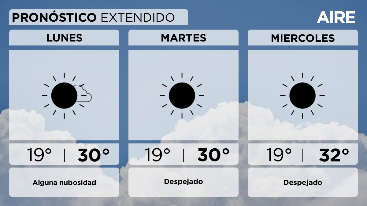 El miércoles también predominará el cielo despejado. Temperatura mínima de 19°, máxima de 32° y viento leve del noreste.