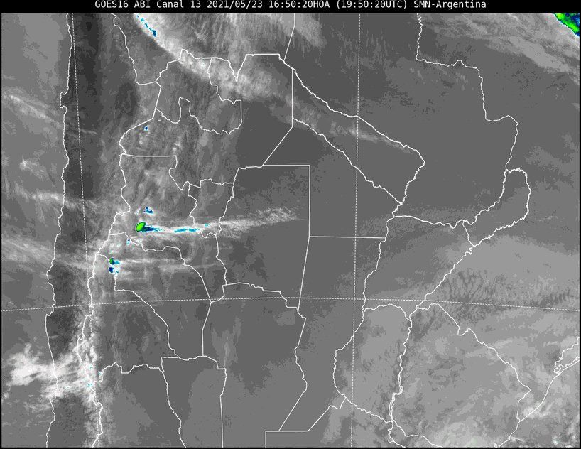 En la imagen satelital se observa la nubosidad desplazándose hacia el este, siguiendo la trayectoria del centro de baja presión que produjo fuertes ráfagas de viento en la jornada del sábado -que alcanzaron los 66km/h en la ciudad de Santa Fe-, y la del domingo.
