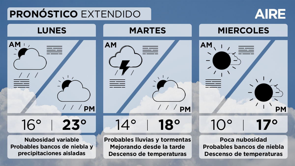 El martes el día comenzará con condiciones inestables y habrá probabilidad de lluvias y algunas tormentas. Las condiciones mejorarán paulatinamente desde la tarde. Las temperaturas irán en descenso con una mínima de 14° a final de la jornada, 16° por la mañana, y una máxima de 18°. El viento será leve a moderado del sur con posibles ráfagas de mayor intensidad.