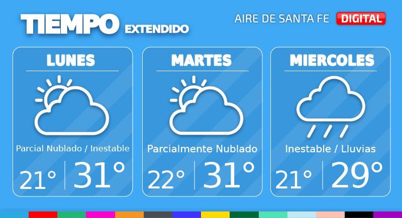 Después de un fin de semana inestable en la ciudad de Santa Fe, se prevé un lunes con cielo parcialmente nublado, pero con condiciones inestables y baja probabilidad de precipitaciones. La temperatura mínima será de 21°, la máxima de 31° y habrá viento leve a moderado del sudeste, según indicó el especialista en clima de Aire de Santa Fe, Pablo Lucero.