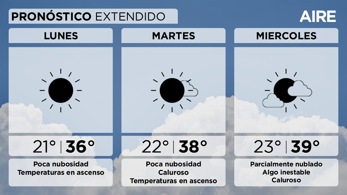 El martes continuaremos con poca nubosidad. Temperatura mínima de 22°, máxima de 38° y viento leve a moderado variando entre noreste y noroeste.