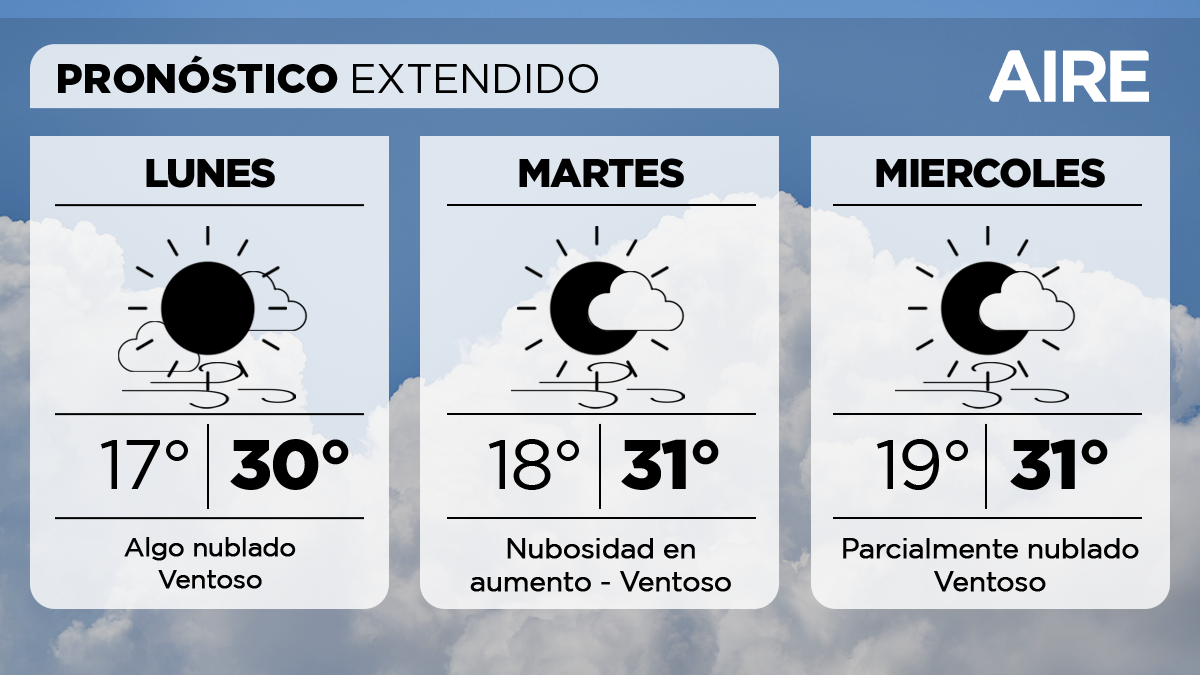 El miércoles, el cielo se presentará parcialmente nublado, con una mínima de 19°, una máxima de 31°, y viento leve a moderado del noreste.
