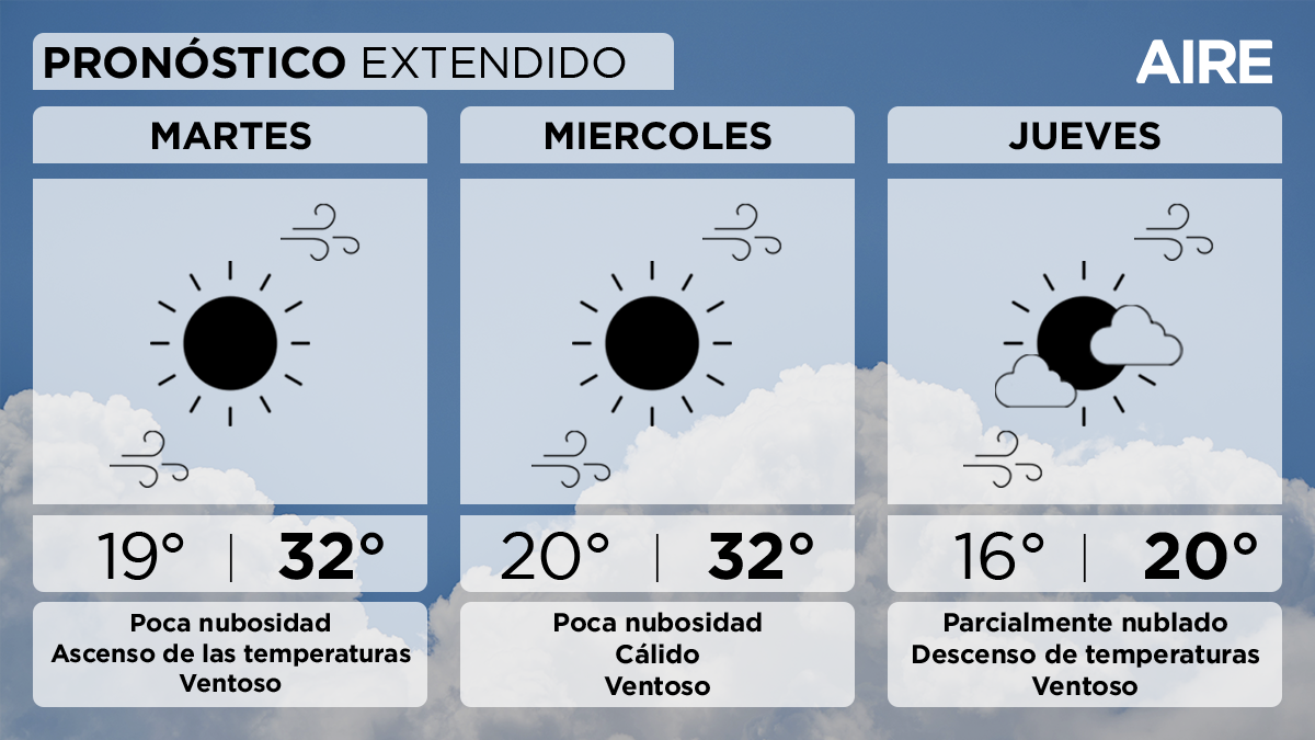 El miércoles el cielo continuará despejado o con poca nubosidad. Temperatura mínima de 20°, máxima de 32° y viento leve a moderado del noreste, con posibles ráfagas de mayor intensidad, rotando al sur hacia la noche.