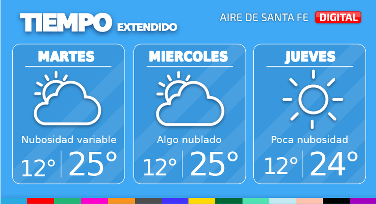 En la ciudad de Santa Fe, el martes habrá cielo con nubosidad variable. Temperatura mínima de 12°, máxima de 25° y viento leve a moderado del sur. El miércoles habrá cielo algo a parcialmente nublado. Temperatura mínima de 12°, máxima de 25° y viento leve del sudeste.