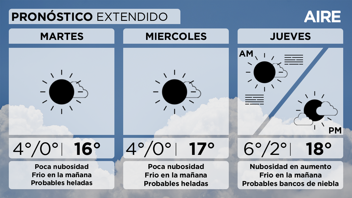 El miércoles también habrá poca nubosidad. Temperatura mínima de 4° en zona urbana, 0° con heladas en zonas con poca edificación, máxima de 17° y viento leve a moderado del noreste.