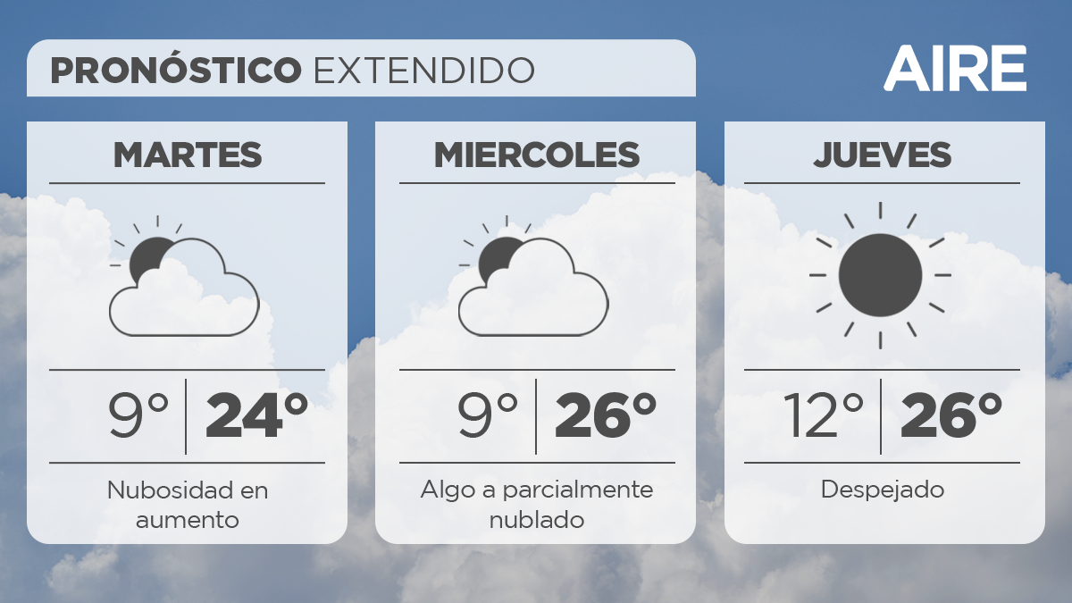 El miércoles el cielo continuará algo nublado. La temperatura mínima será de 9° y la máxima de 26°, con viento leve del sur.