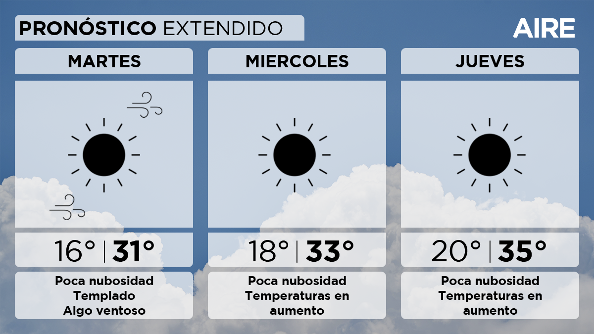 Según el pronóstico extendido, el miércoles continuará con poca nubosidad y seguirá subiendo la temperatura. Se espera una mínima de 18°, una máxima de 33° y viento leve a moderado del noreste.