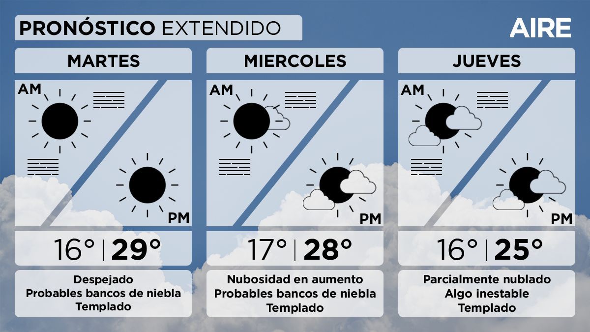 Desde el miércoles se espera que ingresen nubes. La temperatura mínima ese día será de 17° y la máxima de 28°, con viento leve a moderado del noreste.