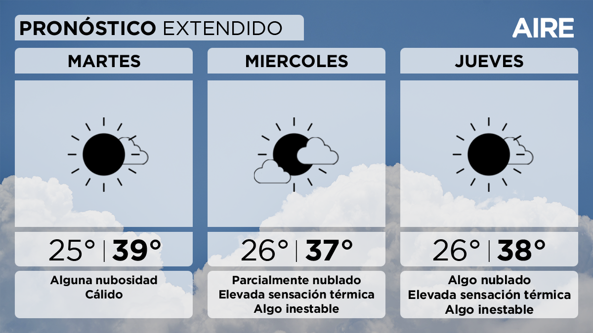 Para el martes se espera cielo algo nublado, con una temperatura mínima de 25°, una máxima de 39° y viento leve a moderado del noreste.