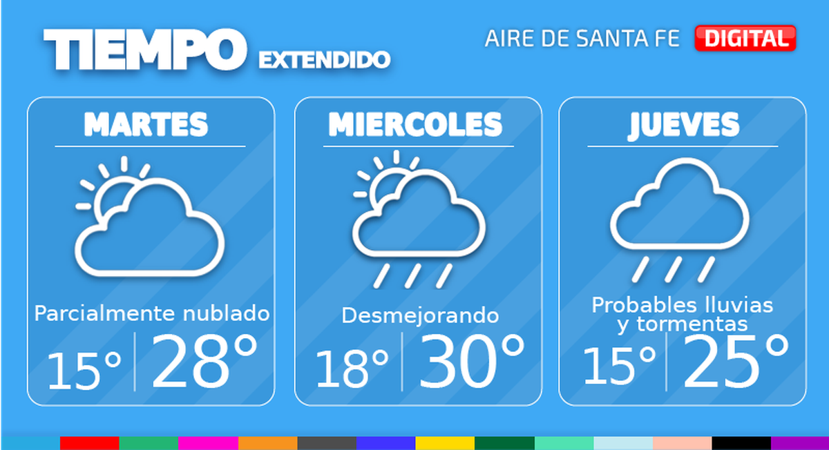 El miércoles habrá condiciones desmejorando con probables lluvias y algunas tormentas desde la tarde. Temperatura mínima de 18°, máxima de 30° y viento leve a moderado del noreste que rotará al sur.