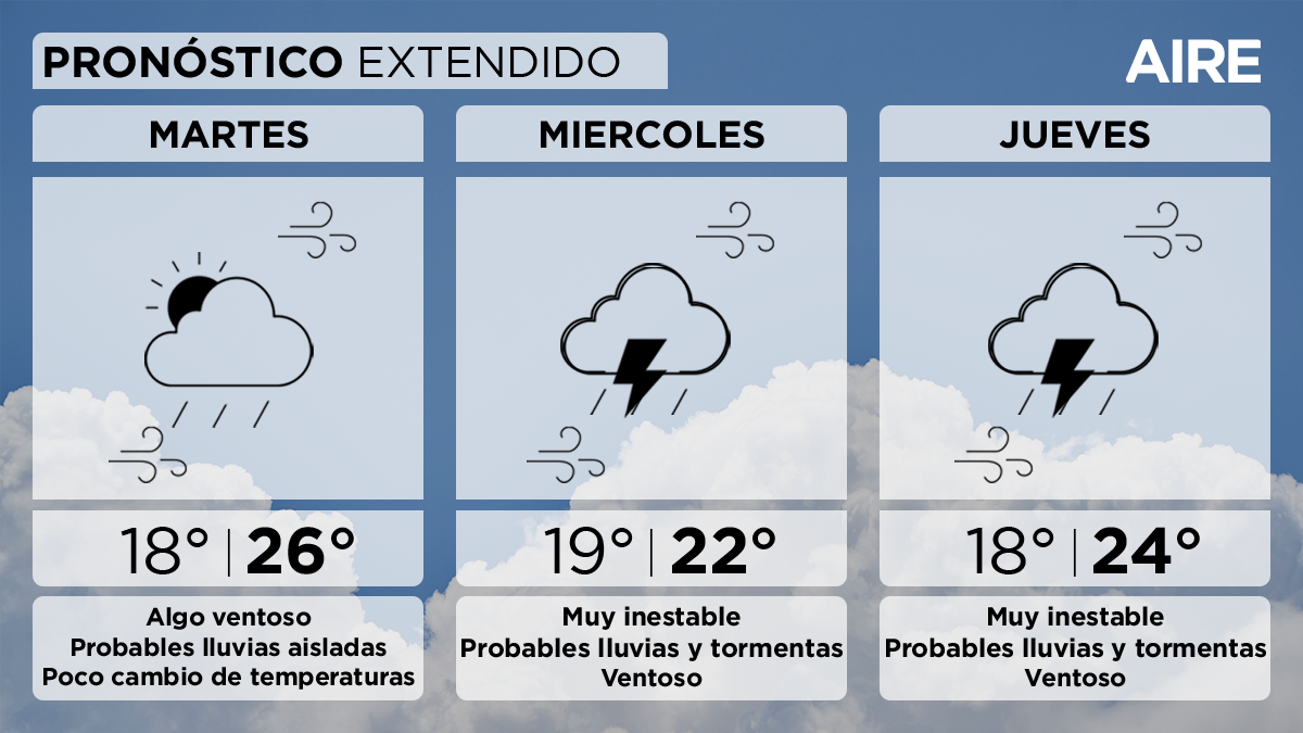 El miércoles las condiciones serán más inestables, esperando lluvias y tormentas, algunas de las cuales podrían ser fuertes. Temperatura mínima de 19°, máxima de 22° y viento leve a moderado del norte con probables ráfagas de mayor intensidad.