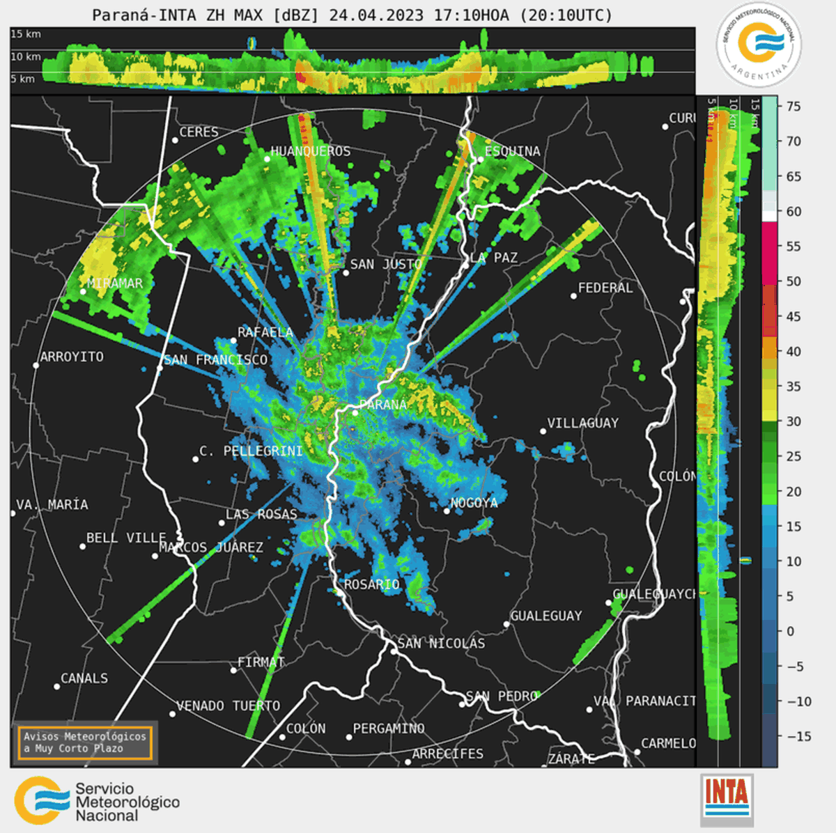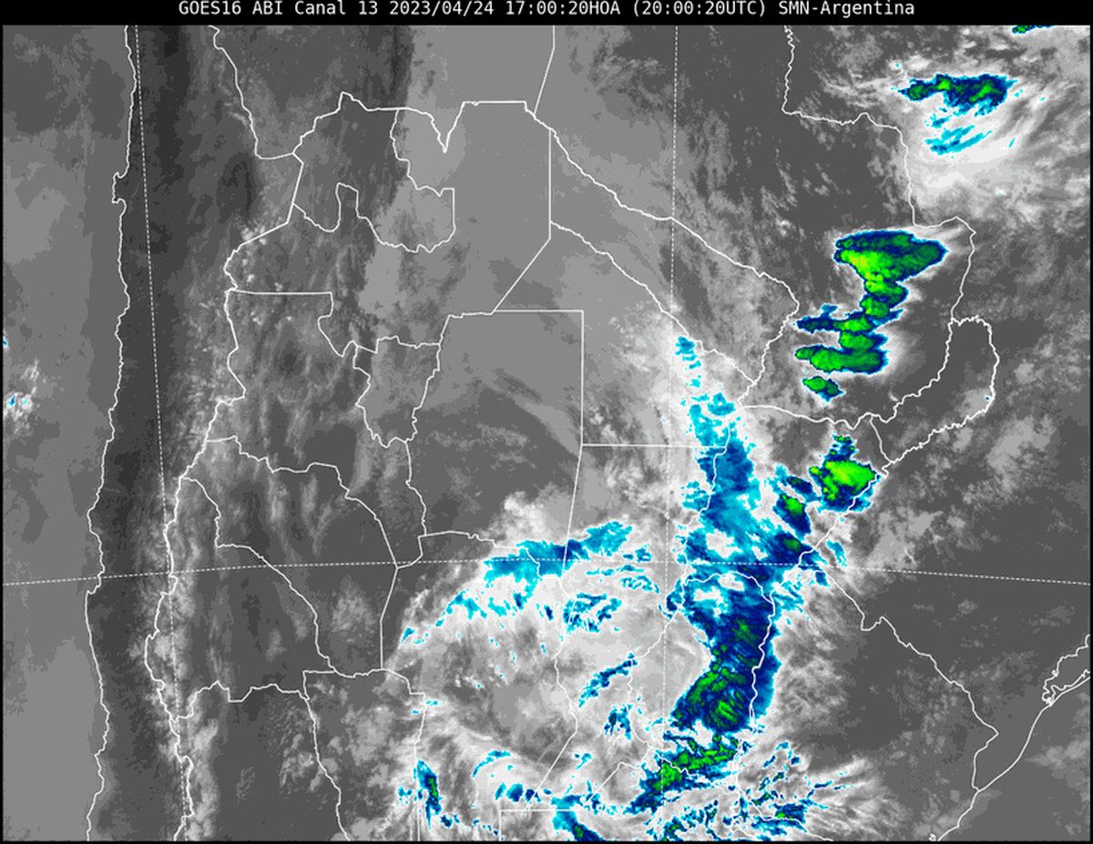 En la imagen satelital se observa que nuestra provincia continúa cubierta con abundante nubosidad. Esta situación produce algunas precipitaciones, visibles en la imagen de radar, que podrán extenderse hasta las primeras horas de martes.