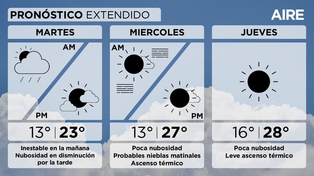 En este período las temperaturas no tendrán variación, manteniendo poca amplitud térmica. Recién en el transcurso de la tarde del martes las condiciones comenzarán a mejorar, con nubosidad en disminución.