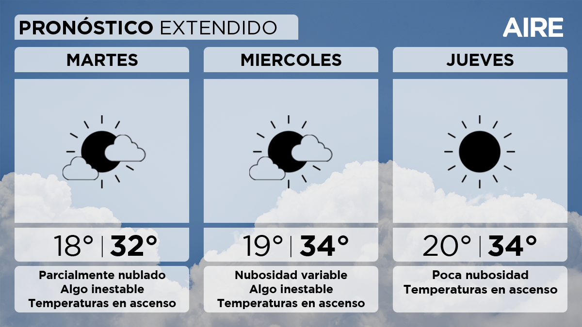 El miércoles se prevé nubosidad variable y condiciones algo inestables. Temperatura mínima de 19°, máxima de 34° y viento leve a moderado del sur.