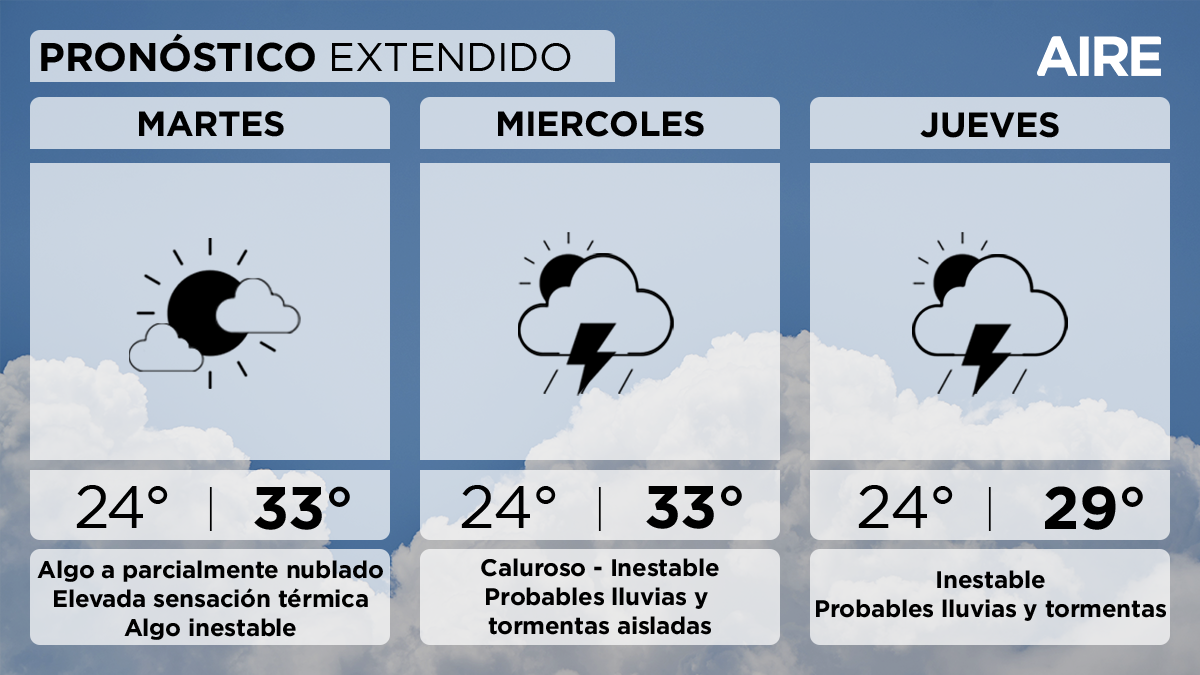 El miércoles las condiciones serán más inestables, con probables lluvias y tormentas aisladas. Temperatura mínima de 24°, máxima de 33° con elevada sensación térmica y viento leve a moderado del noreste rotando al sudeste.