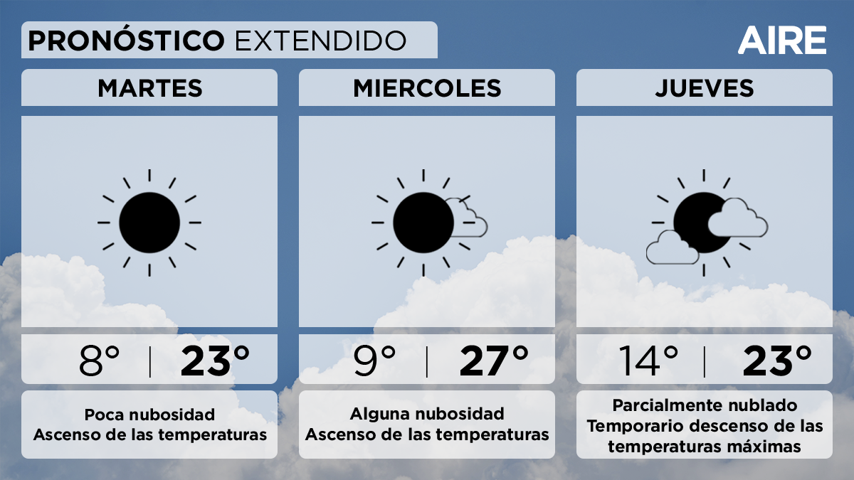 El miércoles el cielo estará algo nublado. Temperatura mínima de 9°, máxima de 27° y viento leve a moderado del norte.