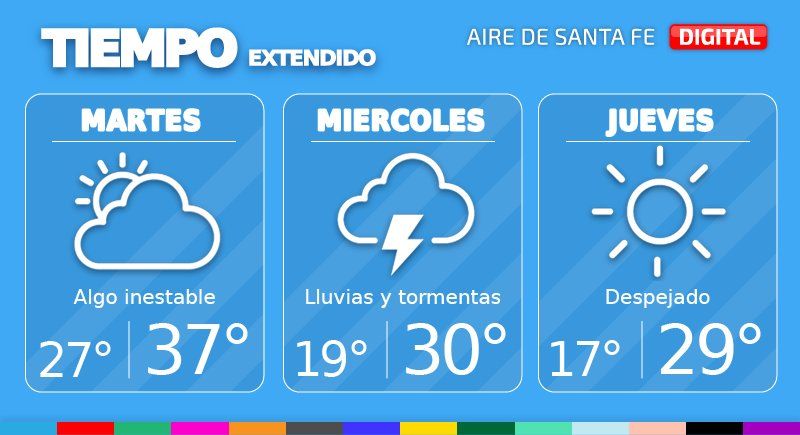 El miércoles tendremos cielo parcial a totalmente cubierto, condiciones inestables con lluvias y tormentas, alguna de las cuales puede ser fuerte. Temperaturas en descenso con mínima de 19° hacia finales de la jornada, máxima de 30° con elevada sensación térmica y viento leve a moderado del sudoeste con ráfagas de mayor intensidad.