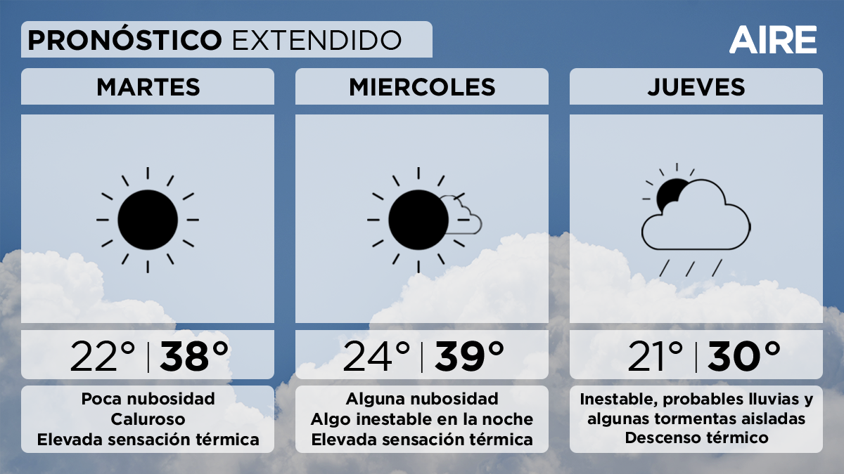 Para el miércoles, el pronóstico prevé alguna nubosidad y condiciones algo inestables. Temperatura mínima de 24°, máxima de 39° y viento leve predominante del este.