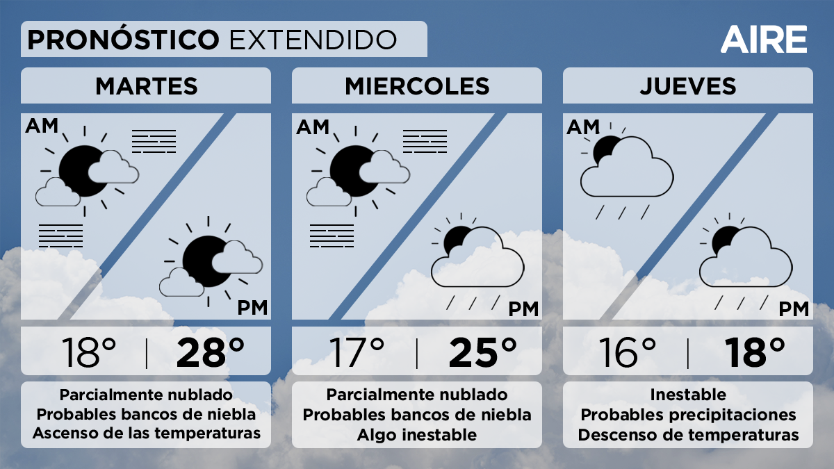 En tanto adelantó que "el cielo permanecería con abundante nubosidad y cierto grado de inestabilidad hasta mediados de la próxima semana".