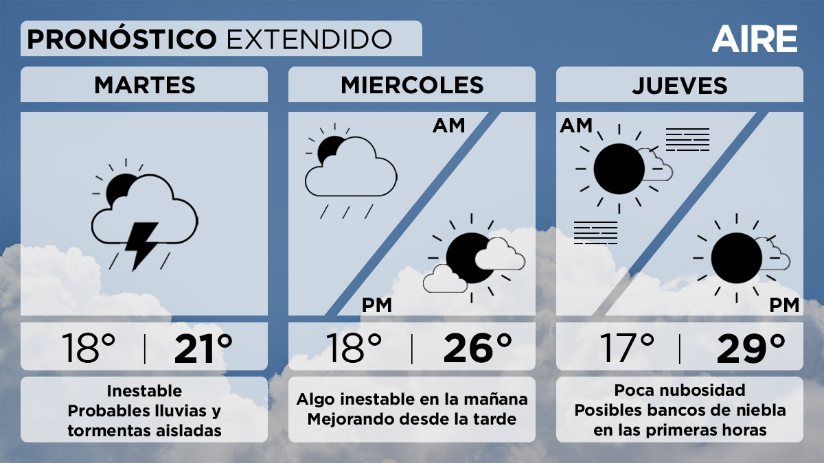 El miércoles comenzará la jornada con probables precipitaciones, pero mejorando las condiciones hacia la tarde. Temperatura mínima de 18°, máxima de 26° y viento leve a moderado del sur.