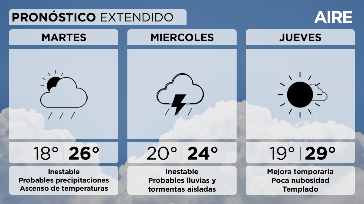 El miércoles las condiciones serán más inestables con probables lluvias y tormentas aisladas. Temperatura mínima de 20°, máxima de 24° y viento leve a moderado del noreste.