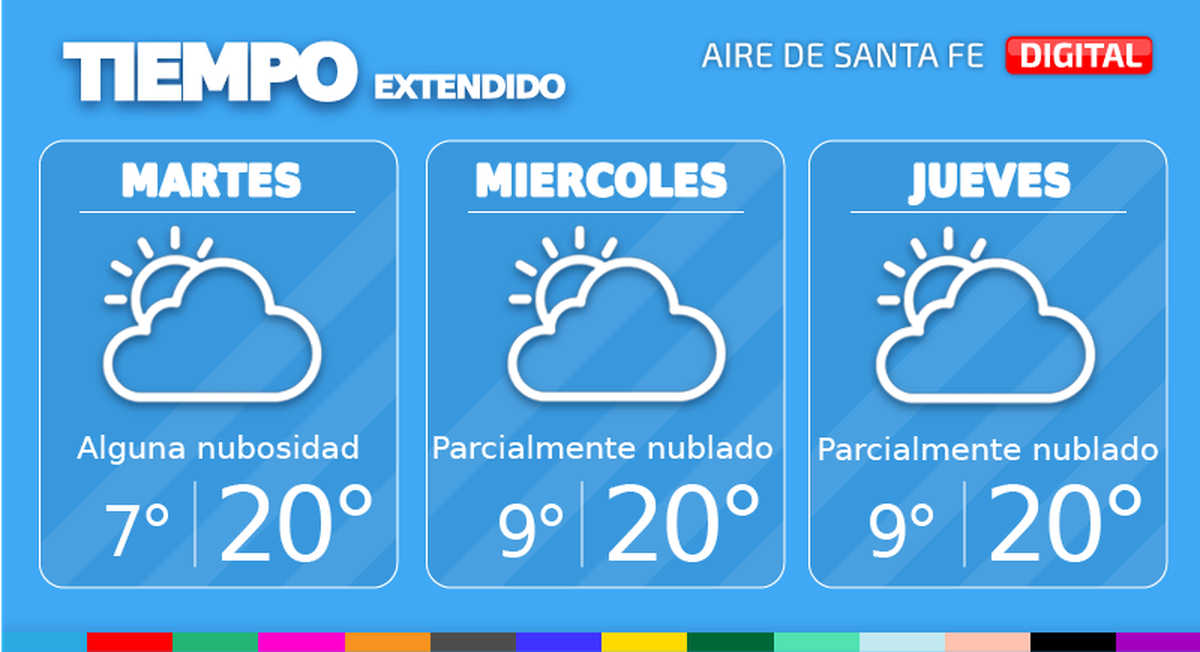 La semana inició con buenas condiciones en el tiempo en la ciudad de Santa Fe. Para este martes se espera cielo algo nublado. Temperatura mínima de 7°, máxima de 20° y viento leve del este rotando al noreste. El miércoles el cielo estará parcialmente nublado. Temperatura mínima de 9°, máxima de 20° y viento leve de direcciones variables.