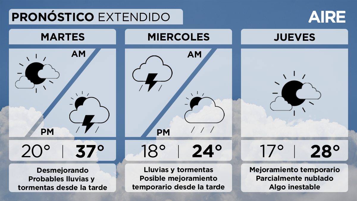 El miércoles continuará con condiciones inestables, siendo probables lluvias y tormentas en las primeras horas y luego un mejoramiento temporario. Temperatura mínima de 18°, máxima de 24° y viento leve a moderado del sudeste.