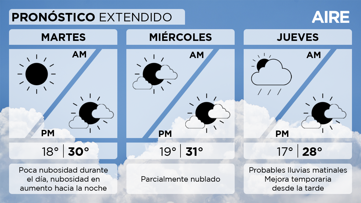 El miércoles el cielo estará parcialmente nublado. Temperatura mínima de 19°, máxima de 31° y viento leve a moderado del noreste.