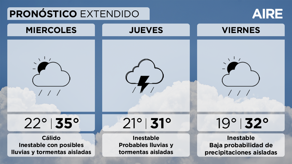 Para el jueves se prevé que las condiciones también serán inestables con probabilidad de lluvias y tormentas aisladas, algunas de las cuales podría ser fuerte de forma localizada. Se pronostica descenso de las temperaturas con mínima de 21°, máxima de 31° con elevada sensación térmica y viento leve a moderado del sur con posibles ráfagas de mayor intensidad.