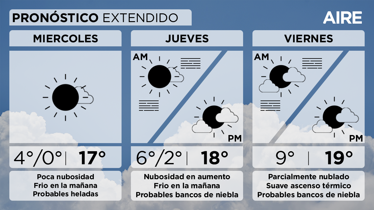 El jueves la nubosidad irá en aumento al igual que las temperaturas, con mínima de 6°, máxima de 18° y viento leve del este.