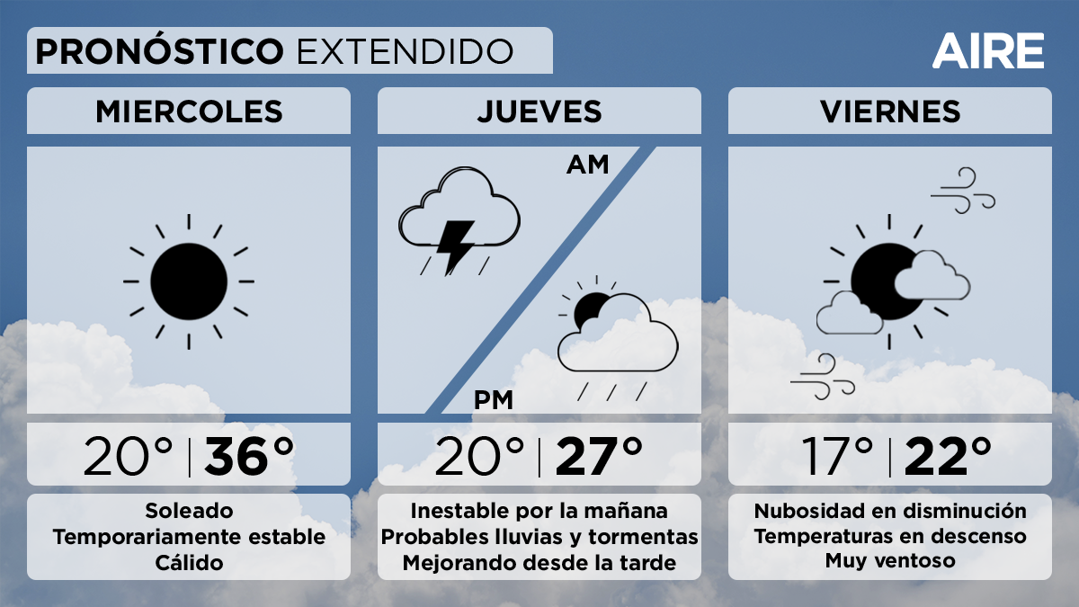 El experto en clima de AIRE, Pablo Lucero, indicó que en la madrugada de mañana jueves se espera que las condiciones vuelvan a desmejorar debido al ingreso de un nuevo frente de aire frío. Este frente será un poco más intenso, produciendo lluvias y tormentas que pueden acumular entre 15 y 35 milímetros, pudiendo superar los 50 milímetros de forma localizada. "No se descarta que algunas de estas tormentas pueden tener intensidad fuerte, produciendo caída de granizo, fuertes ráfagas de viento, chaparrones abundantes y también intensa actividad eléctrica", señaló.