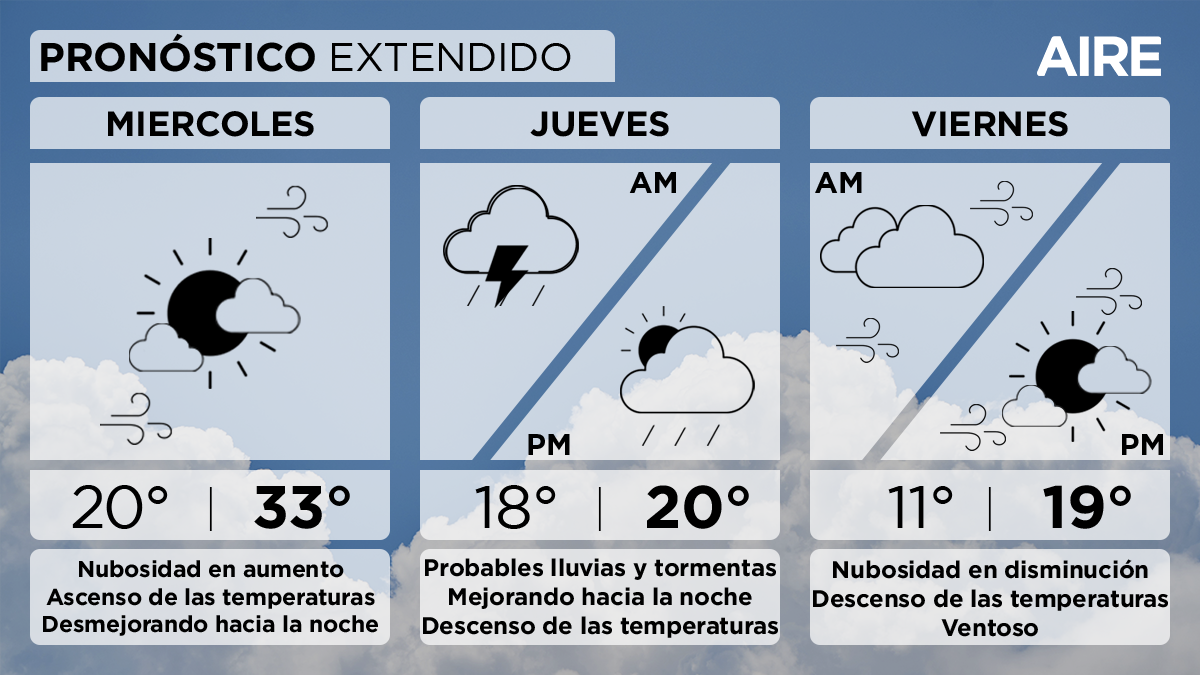 El viernes tendremos nubosidad en paulatina disminución. Temperaturas en descenso con mínima de 11°, máxima de 19° y viento leve a moderado del sudoeste con posibles ráfagas de mayor intensidad.
