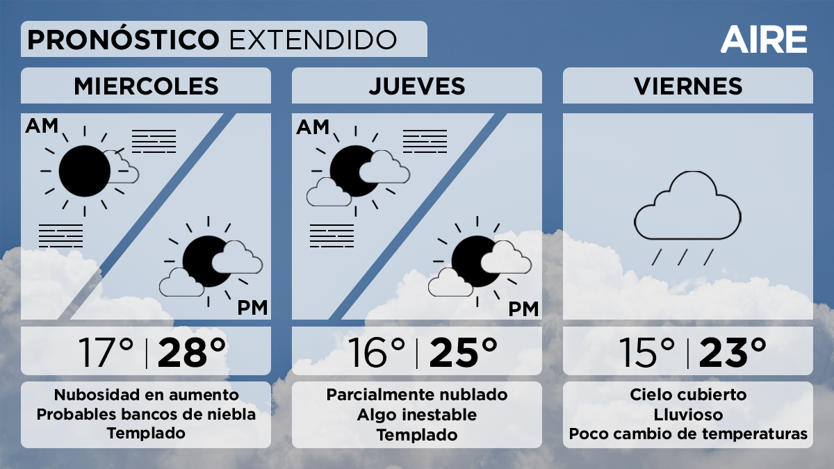El jueves el cielo predominará parcialmente nublado y las condiciones serán algo inestables. Temperatura mínima de 16°, máxima de 25° y viento leve a moderado del sudoeste.