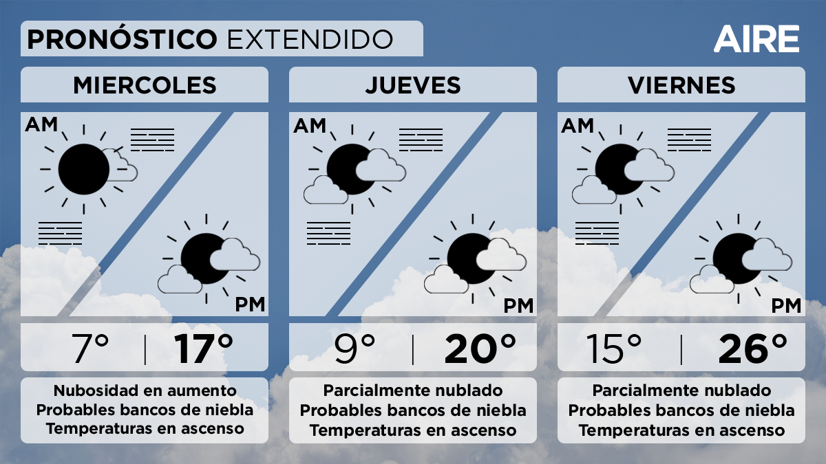 "Este ascenso -siguió- será suave en la jornada del miércoles, pero más firme desde el jueves, llegando al sábado con valores que dependerán de la nubosidad. Esto es así porque también se espera un aumento de la cobertura nubosa, que podría limitar dicho ascenso".