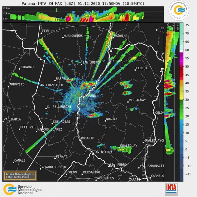 Si bien las imágenes satelitales muestran poca nubosidad en esta región, el especialista en clima de Aire de Santa Fe, Pablo Lucero, informó que en el radar meteorológico se detectan pequeñas zonas de precipitaciones moderadas a intensas al norte de la capital santafesina. En estas zonas se detectan descargas eléctricas de manera esporádica, por lo que toman la forma de tormentas.