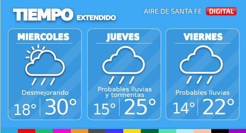 En la ciudad de Santa Fe y zona desmejoran las condiciones del tiempo este miércoles y se prevén probables lluvias y algunas tormentas en el transcurso de la tarde. Se espera una temperatura mínima de 18°, una máxima de 30° y viento leve a moderado del noreste que rotará al sur hacia la noche.